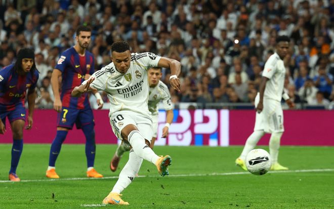 這是本賽季的首次西班牙國際德比,皇馬坐鎮主場面對巴薩先聲奪人,來自姆巴佩的建功。上半場第22分鐘,貝林厄姆前場送出直塞助攻,姆巴佩反越位形成單刀機會,最后一腳推射入網,幫助皇馬1-0領先,連續四場國家德比破門,成為本世紀以來第3位做到這一點的球員。